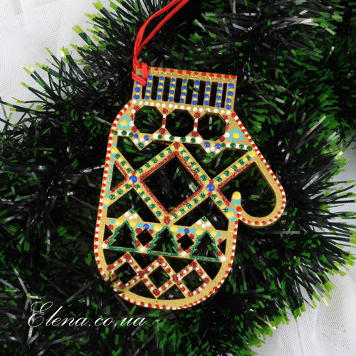 Украшение для ёлки - подвеска в форме рукавички с ажурно вырезанным рисунком и яркой точечной росписью.