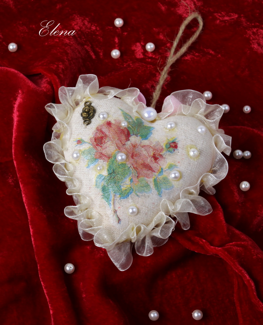 Нежное сердечко, украшено кружевами, жемчужными бусинками и маленькими подвесочками. Порадует тех, кто ценит стиль винтаж.