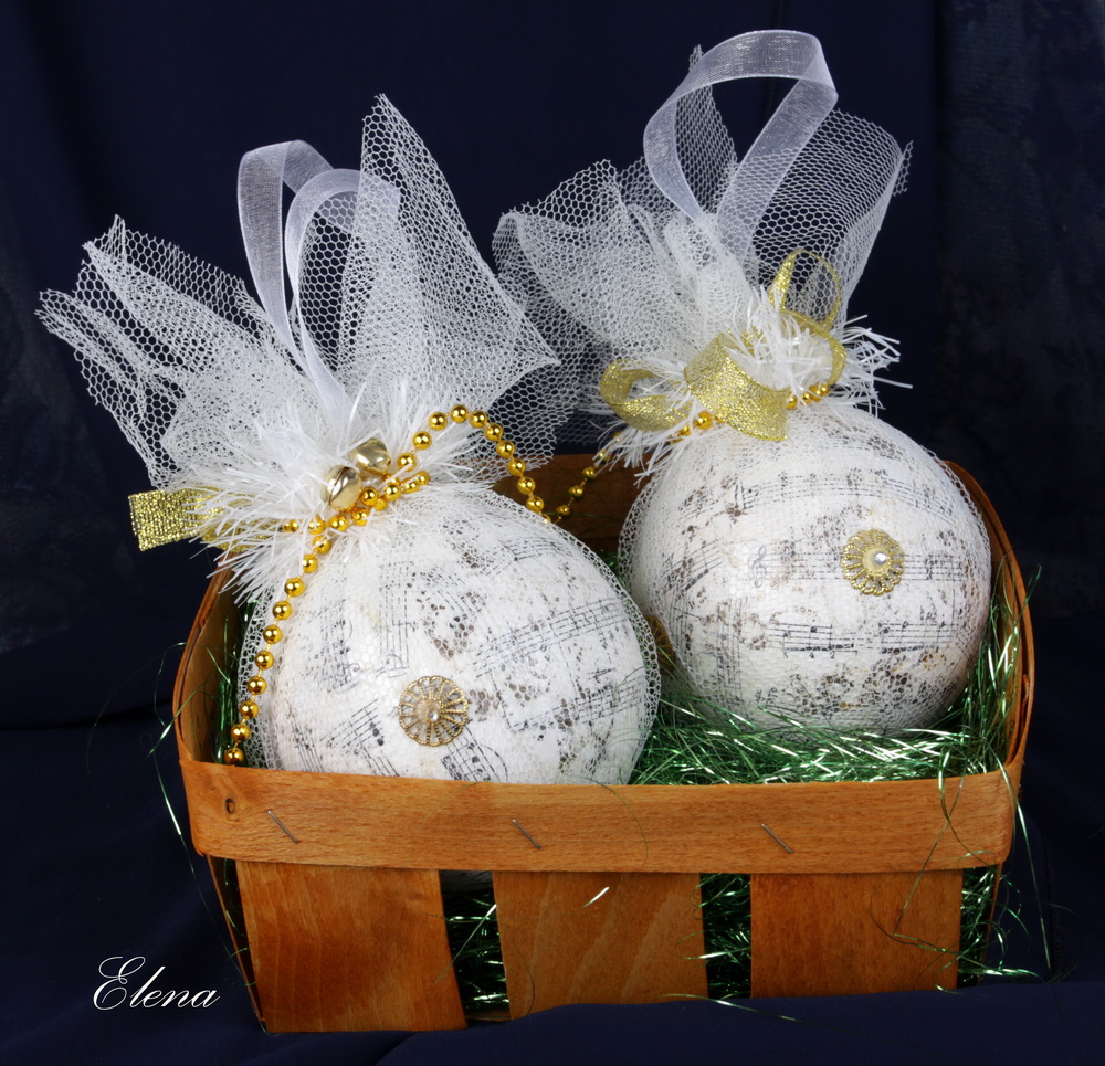 Два ёлочных шарика в бело-золотой гамме, задекорированы и упакованы в подарочную коробку. Шары из небьющегося материала.
