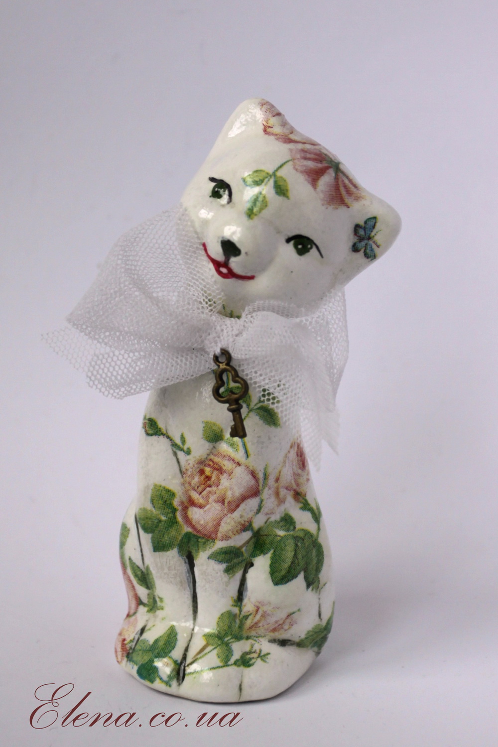 Кошечка украшена пышным бантом из фатина, на бантике прикреплен маленький ключик. Декорирована в технике декупаж, мордочка нарисована вручную.