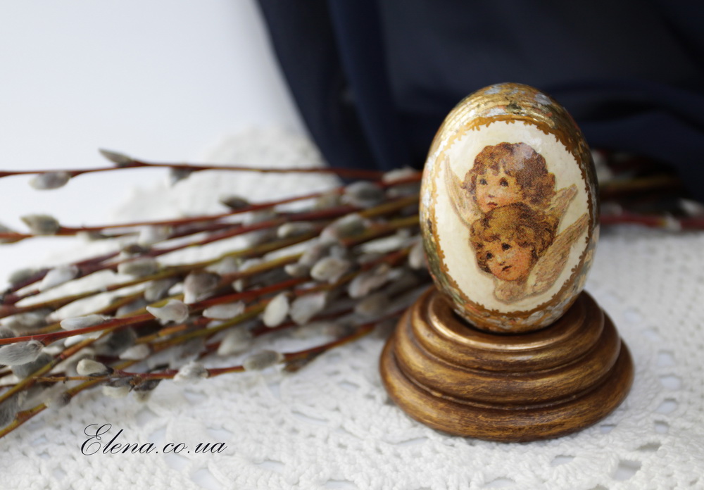 Яйцо с изображением пары ангелочков покрыто разноцветной поталью. Стоит на подставке, не закреплено.