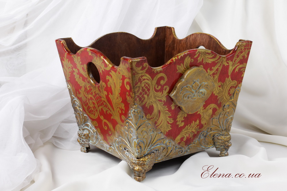 Размеры по верху 20*20 см, по дну 15*15 см, высота с ножками 17 см. Материал - фанера.