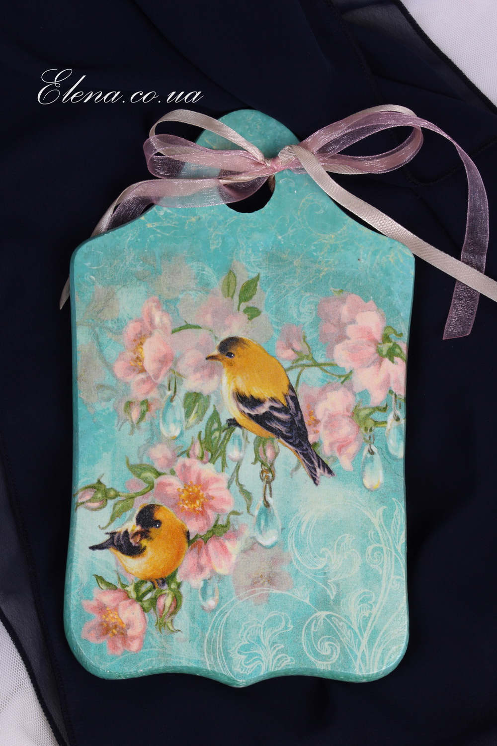 Обратная сторона - натуральное дерево без обработки химическими средствами, можно использовать как разделочную или сервировочную доску. Доска украшена бантиками, прекрасно подойдет в качестве подарка.