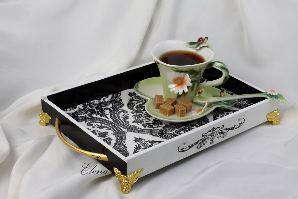 Классический узор, лаконичная цветовая гамма, дополнительные аксессуары золотого цвета - этот поднос порадует человека с хорошим вкусом!