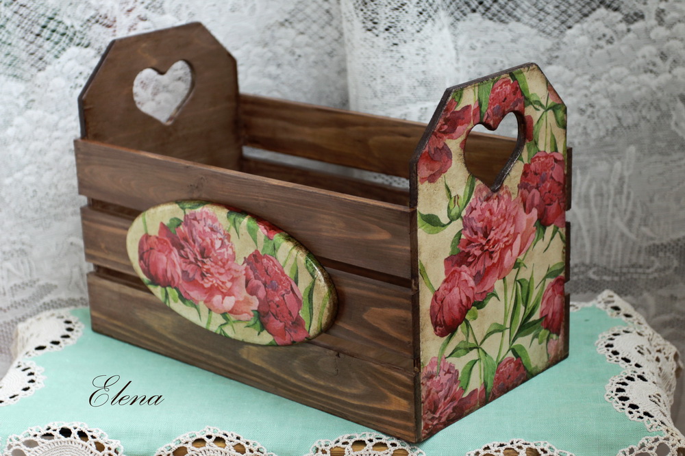 Яркие пионы, ручки-вырезы в форме сердечек, красота натурального мореного дерева - этот ящик никого не оставит равнодушным!