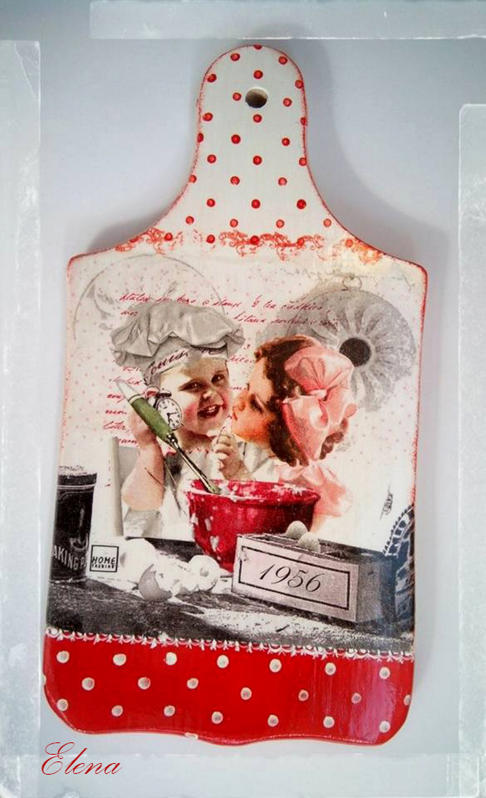 Досочка в винтажном стиле. Милые детки и красно-белые горохи никого не оставят равнодушным! Хорошее настроение на кухне с такой досочкой будет вам обеспечено.