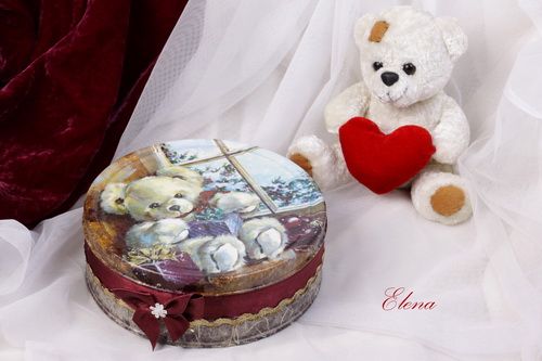 Коробка для упаковки сладкого подарка под ёлочку с изображением медвежонка, украшена лентами и золотистой тесьмой.