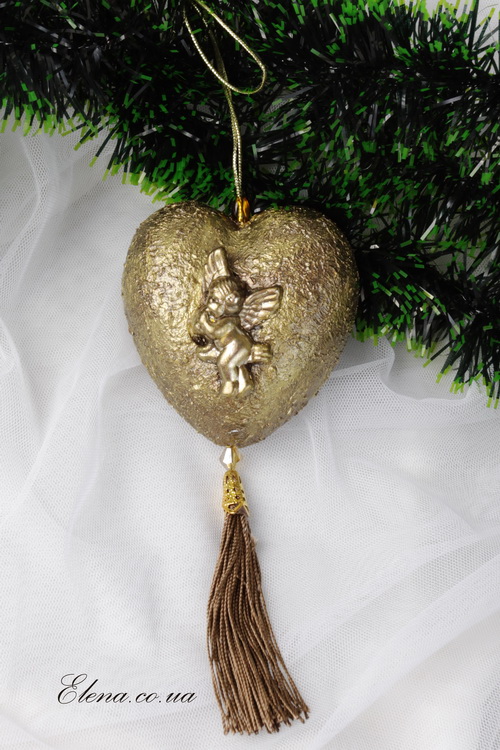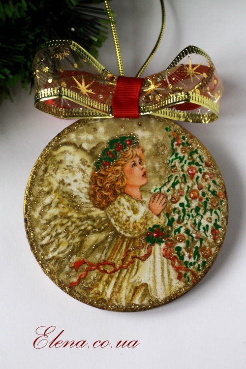 Новогодний ёлочный шар, украшен кисточкой, бантиками и стеклянной бусинкой.