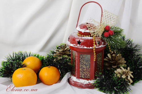 Декоративный фонарь, украшенный флористической композицией, стёкла фонарика расписаны блестящими узорами, создан искусственный эффект заснеженности.