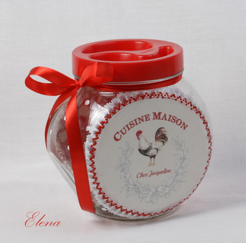 Яркая банка с петушком в красно-белых тонах. Прекрасный подарок и украшение кухни.