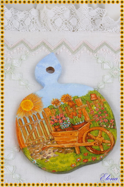 Украсит кухню и поднимет настроение солнечная доска-панно с уютным деревенским пейзажем.