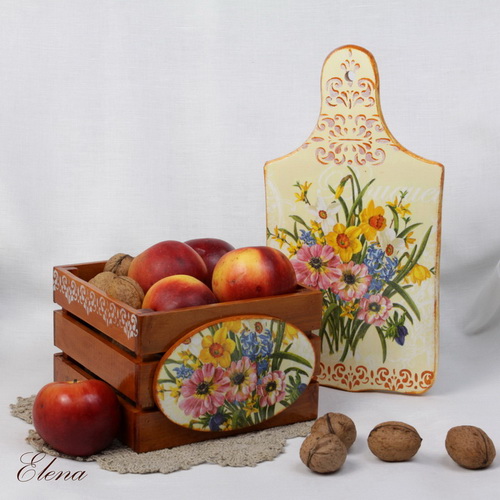 Яркий набор с изображением букета весенних цветов состоит из доски и мини-ящичка.