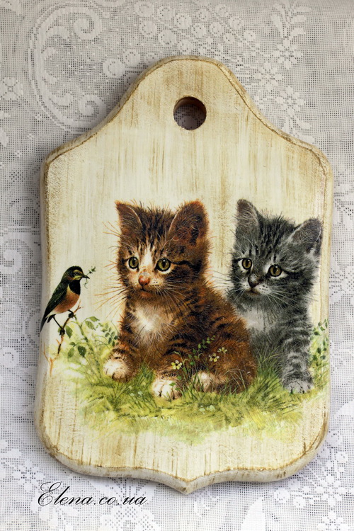 Пара симпатичных котиков, наблюдающих за птичкой, украшает эту небольшую дощечку-панно.