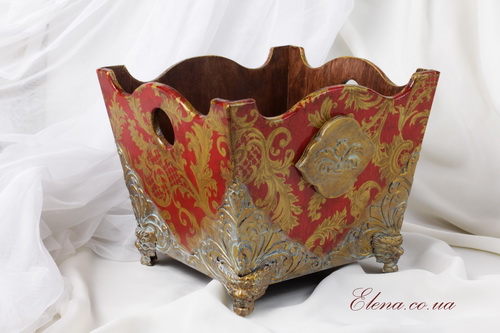 Подставка в красно-золотых тонах, в которую можно красиво и аккуратно поставить бумажные салфетки для сервировки стола.