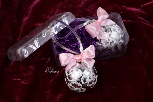 Два ёлочных шарика в серебристо-белой гамме, расписаны вручную и упакованы в подарочную коробку.