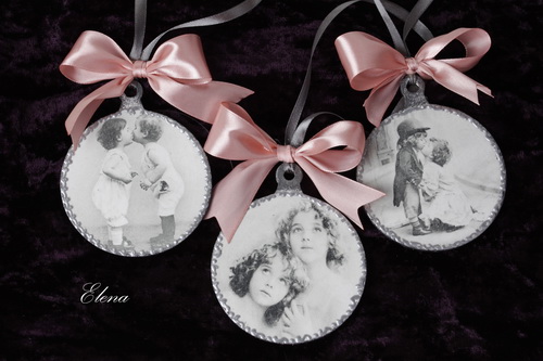 Комплект ёлочных украшений - три круглые подвески с нежно-розовыми атласными бантами.