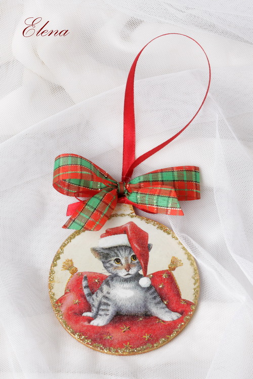 Украшение на ёлочку с милым котиком в новогодней шапочке.