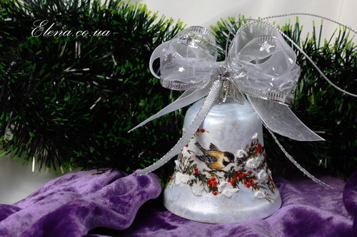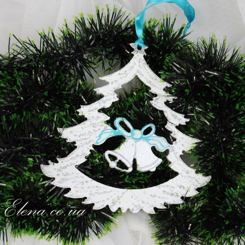 Фигурно вырезанное новогоднее украшение в виде заснеженной ёлки с колокольчиком.