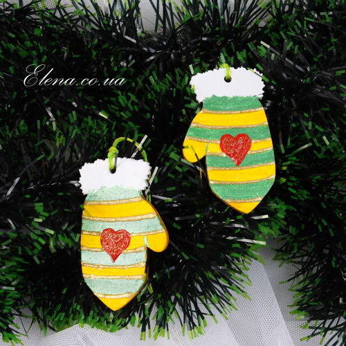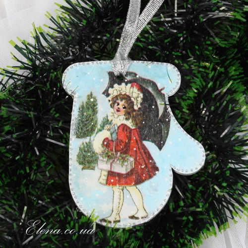 Украшение для ёлки - подвеска в форме рукавички с рисунками на новогоднюю тематику.