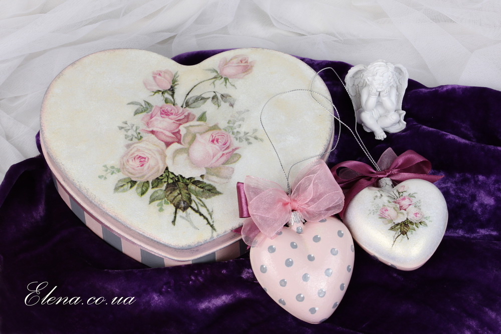 Подвески одинаковые, двухсторонние, с одной стороны - изображение букета роз, с другой - нежный "горошковый" фон. Украшены бантиками. Короб внутри без декора.