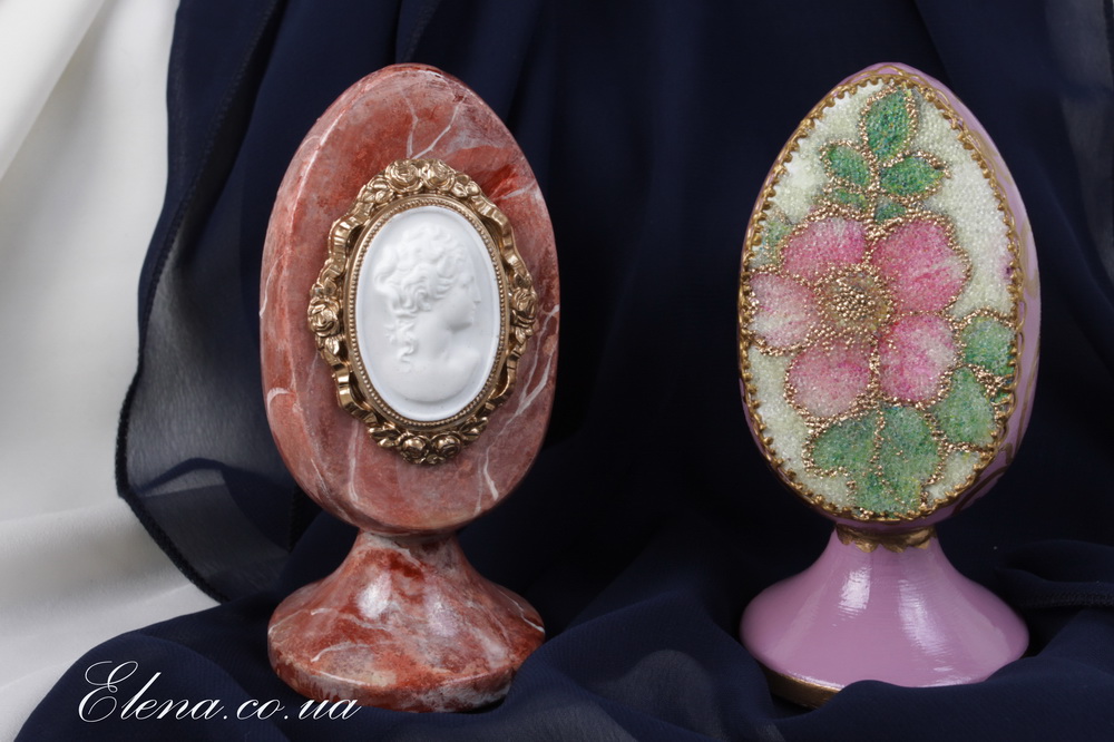 Одно яйцо выполнено в классическом стиле, камея на имитированном мраморе. Второе - фантазийное, украшено цветком шиповника и золотыми узорами.