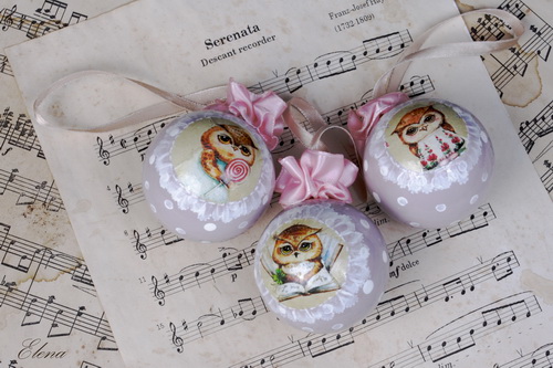 Три шарика с изображениями совушек выполнены по мотивам рисунков художницы Инги Пальцер, украшены ленточками.