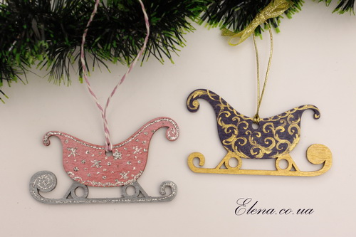 Ёлочное новогоднее украшение - подвеска в виде саночек, расписанная вручную.
