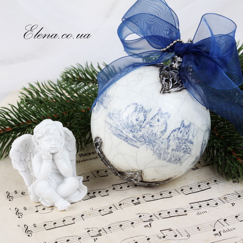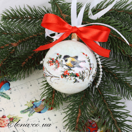 Ёлочное или интерьерное новогоднее украшение - шар c изображением птичек, украшенный бантиками.