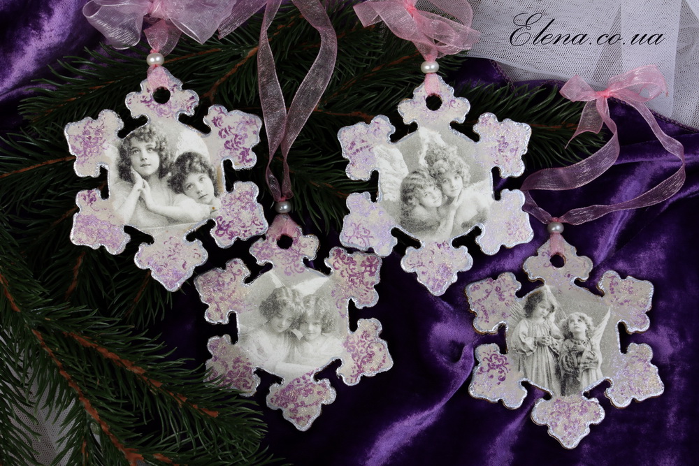 Изображения ангелов в стиле винтаж, разные на всех снежинках, дополнительный декор - бусинки и бантики. Замечательный новогодний подарок на добрую память!